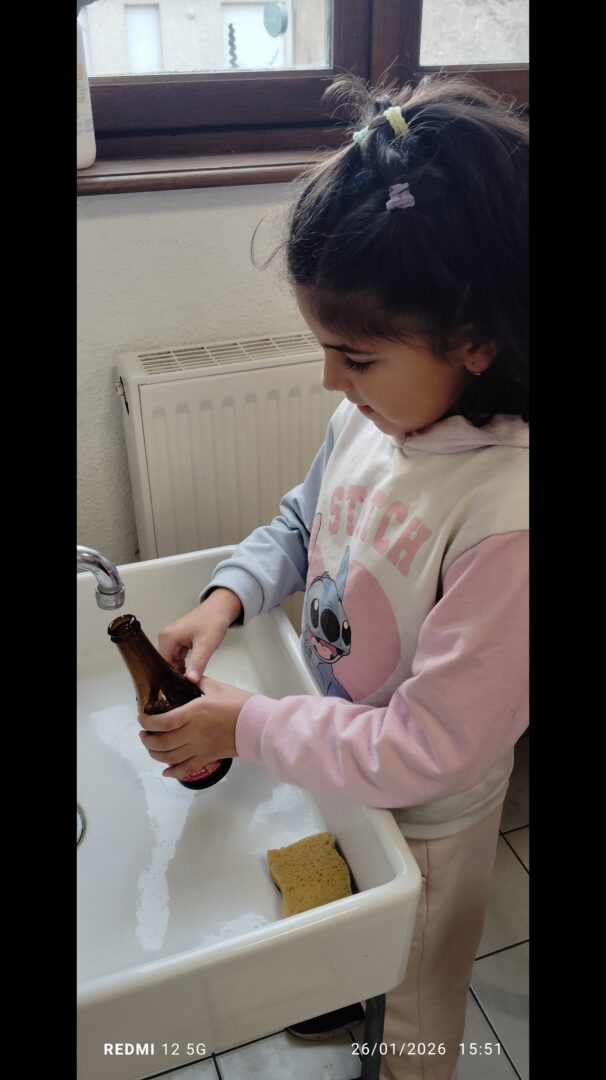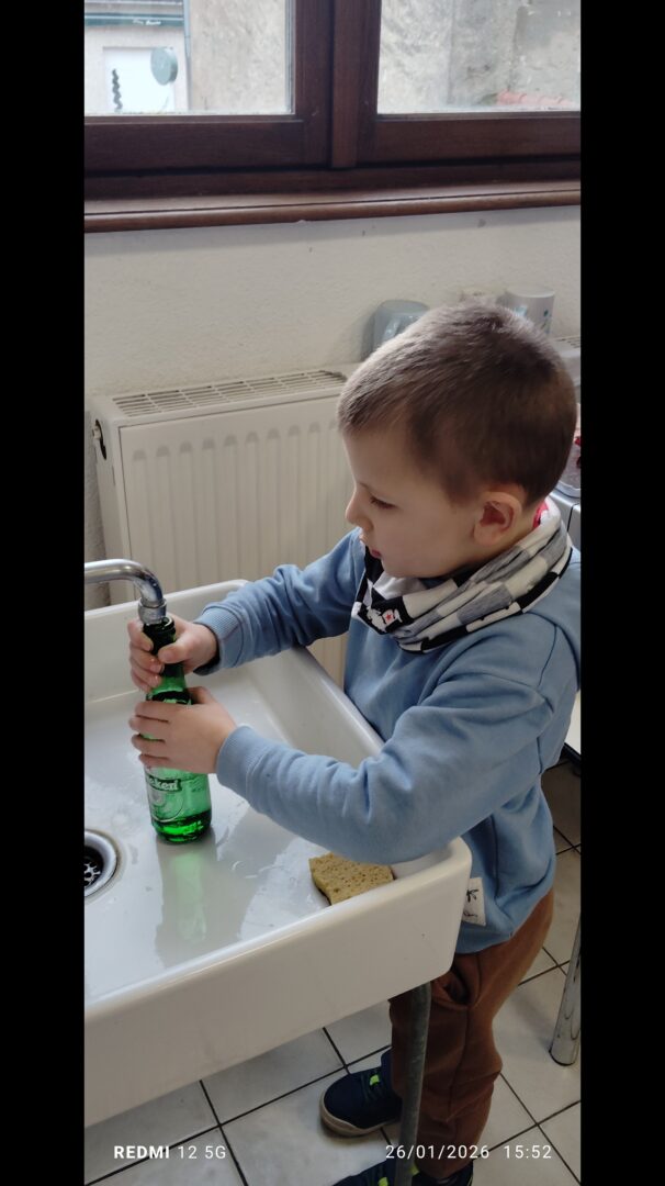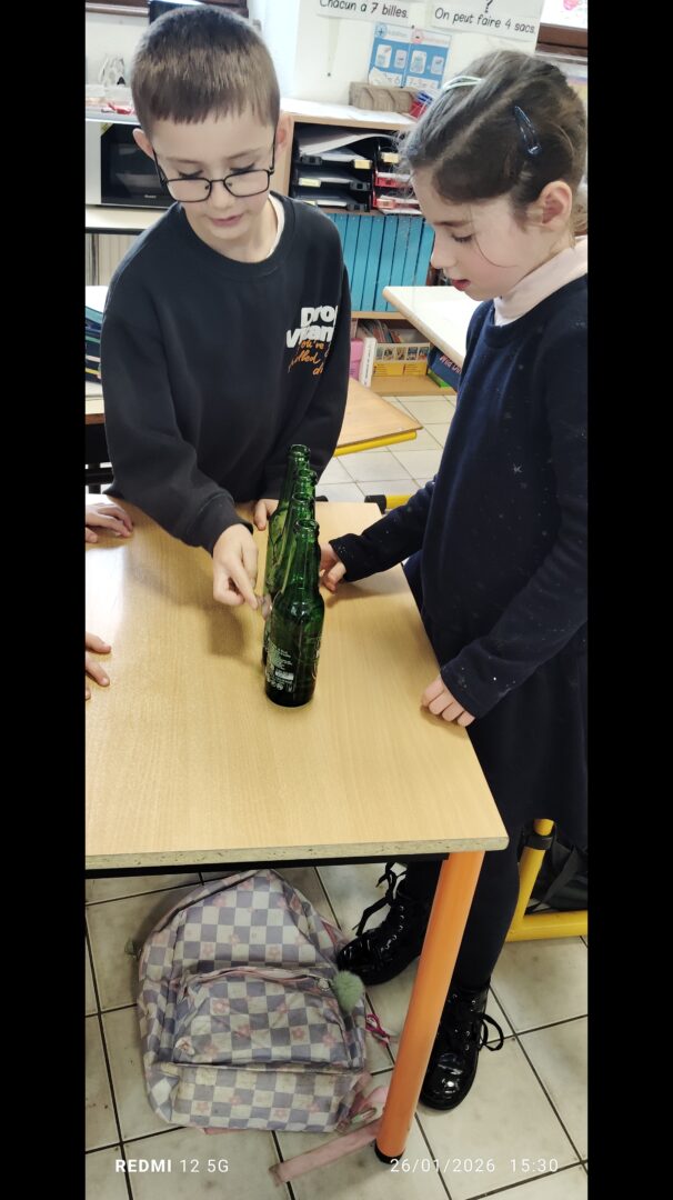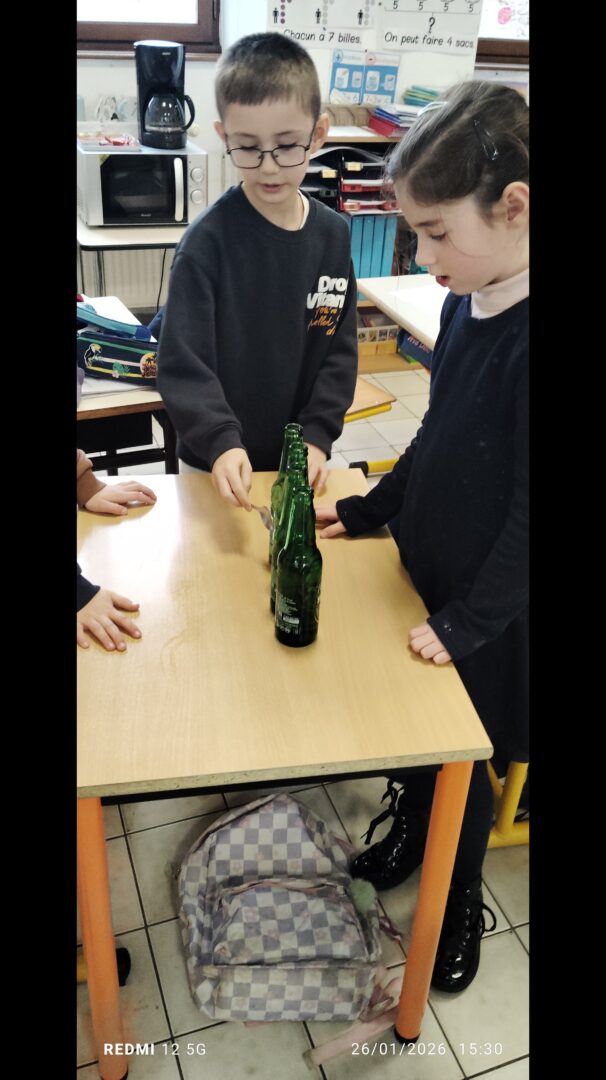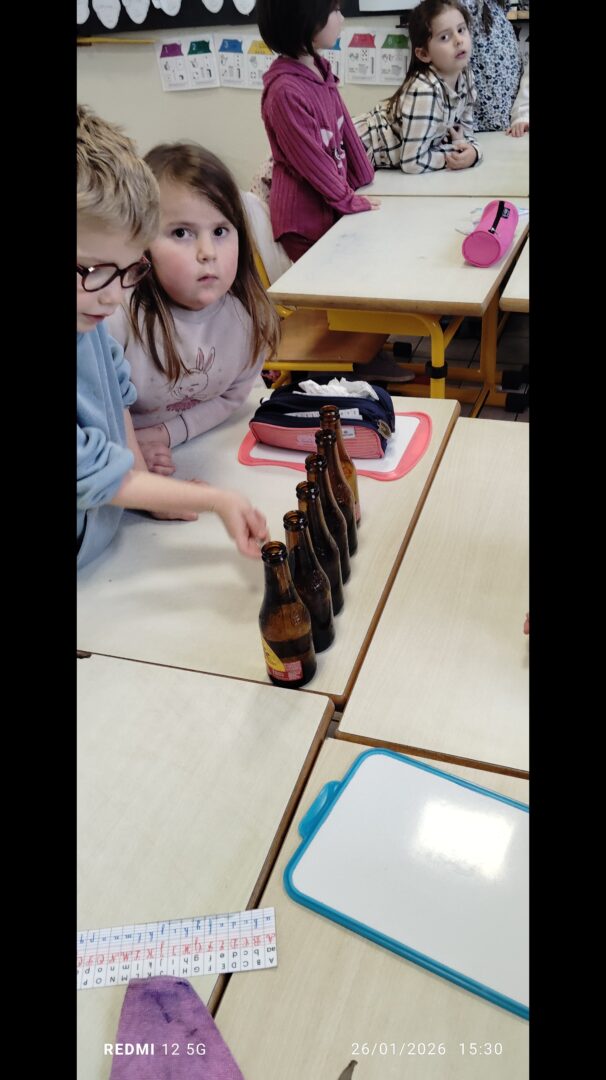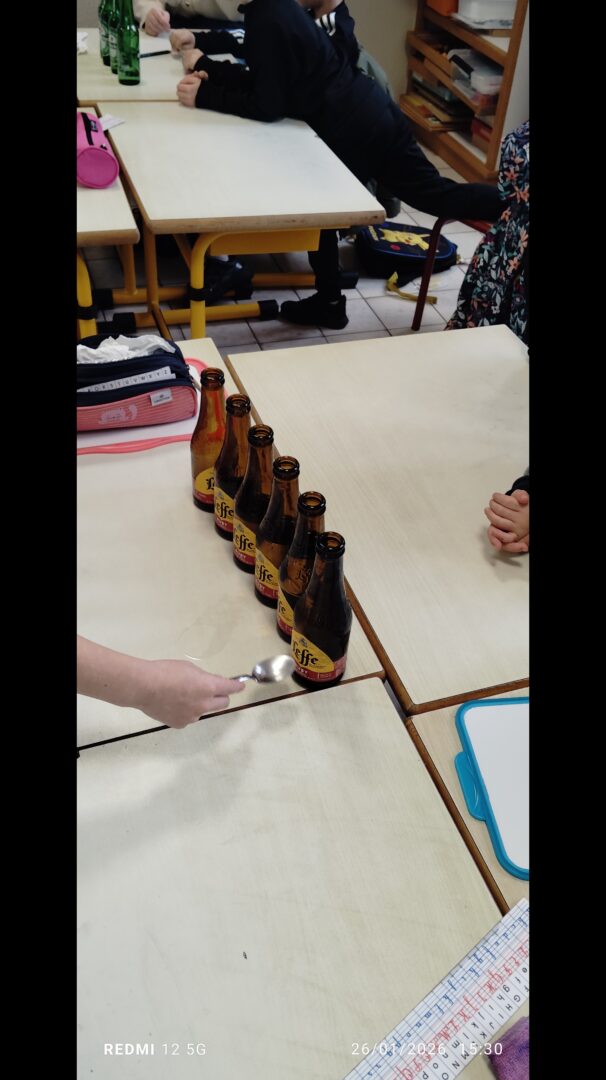 En groupe, munis de bouteilles en verre qu’ils ont rempli d’eau, les enfants ont crée des mélodies.